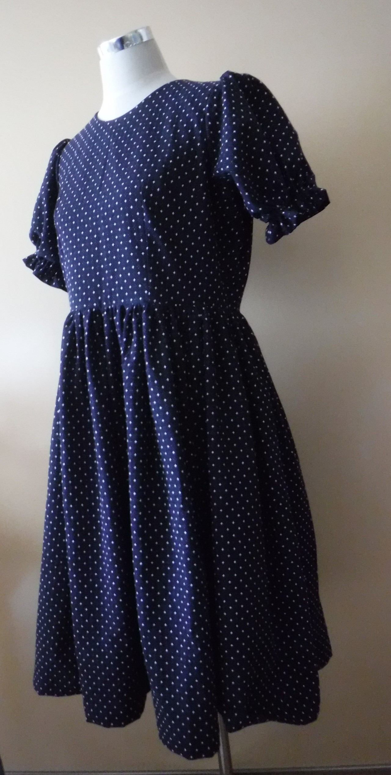 パフスリーブのワンピースをネイビー×ドット柄でお仕立てしました。